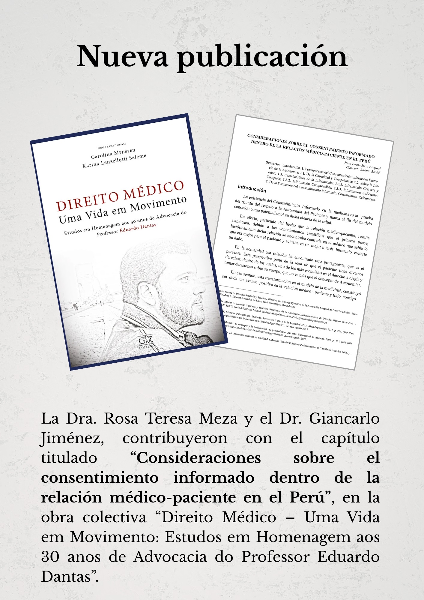 La Dra. Rosa Teresa Meza y el Dr. Giancarlo Jiménez, socios fundadores de Meza & Jiménez Abogados, participaron como coautores en la obra colectiva “Direito Médico – Uma Vida em Movimento: Estudos em Homenagem aos 30 anos de Advocacia do Professor Eduardo Dantas”, publicada en Río de Janeiro por GZ Editora, bajo la coordinación de Carolina Mynssen y Karina Lanzellotti Saleme.