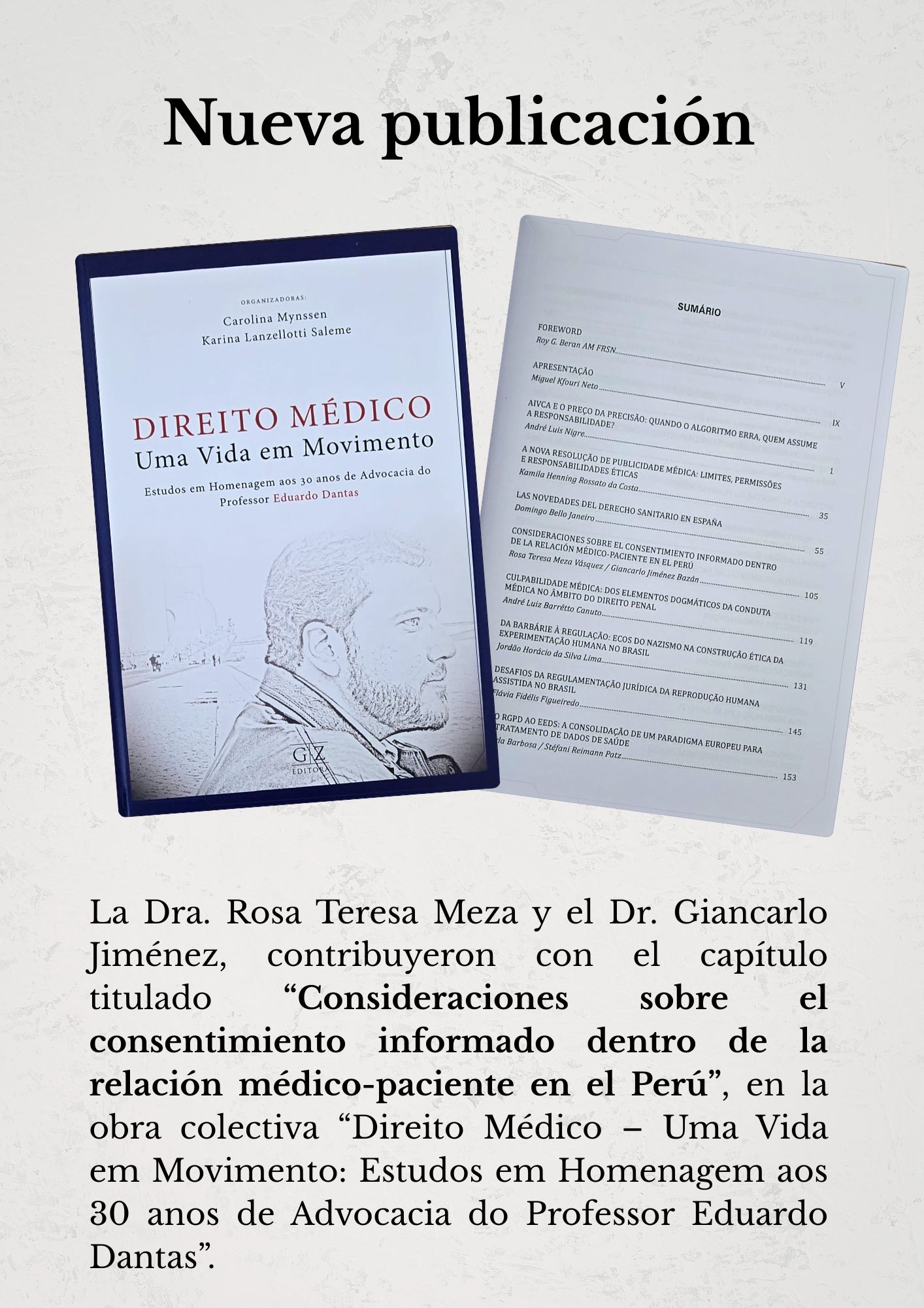 La obra reúne investigaciones de destacados especialistas en Derecho Médico de Iberoamérica y Europa, y constituye un homenaje académico al profesor Eduardo Dantas, referente brasileño en esta especialidad.